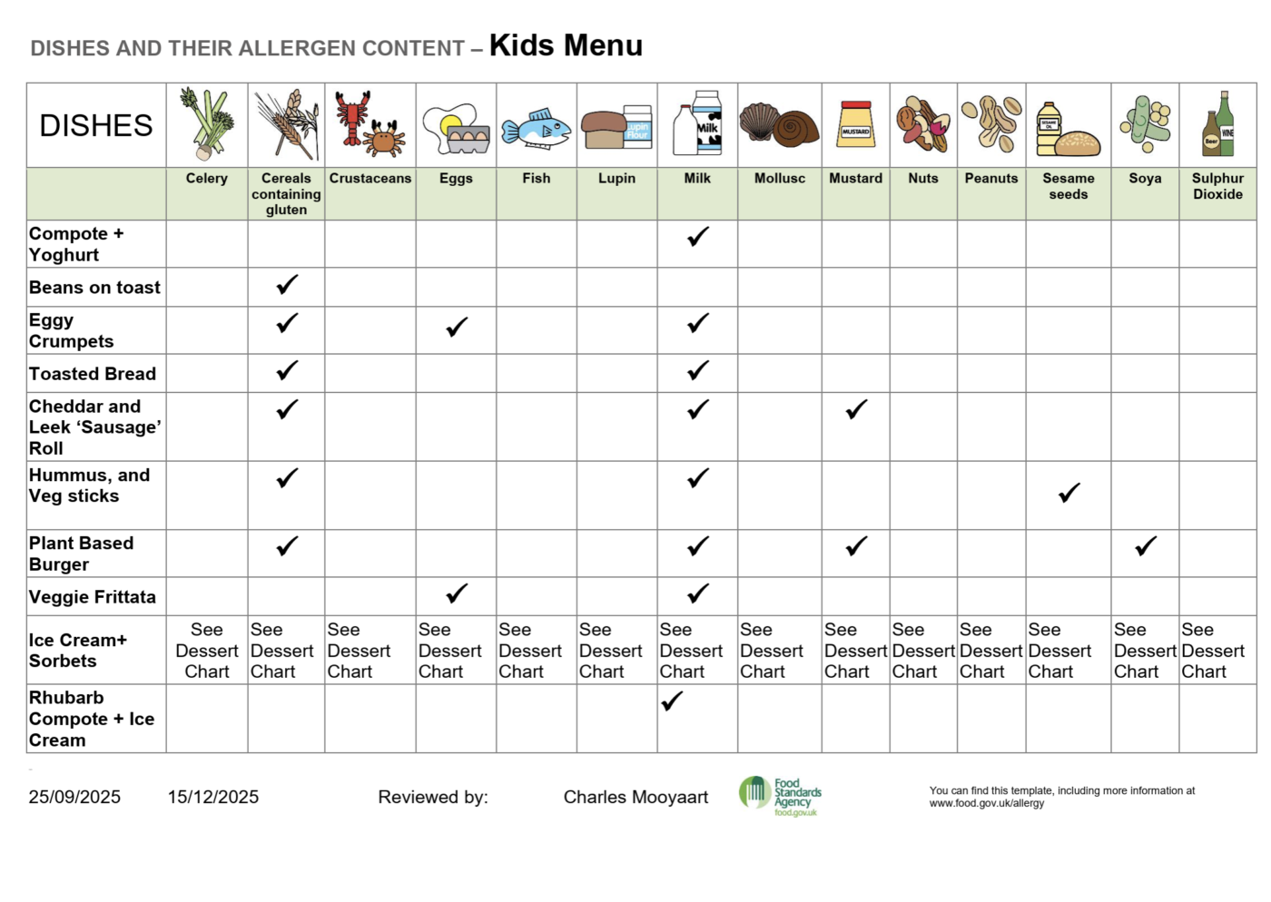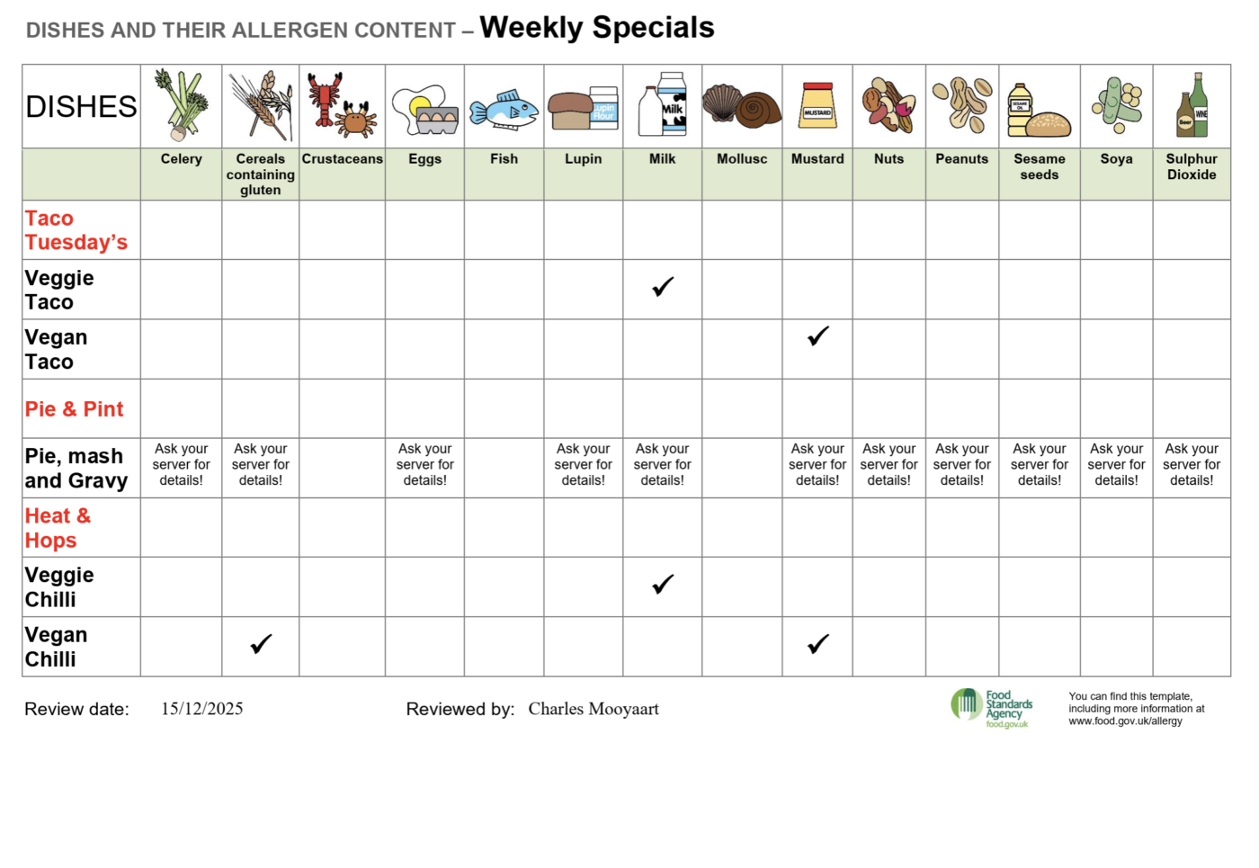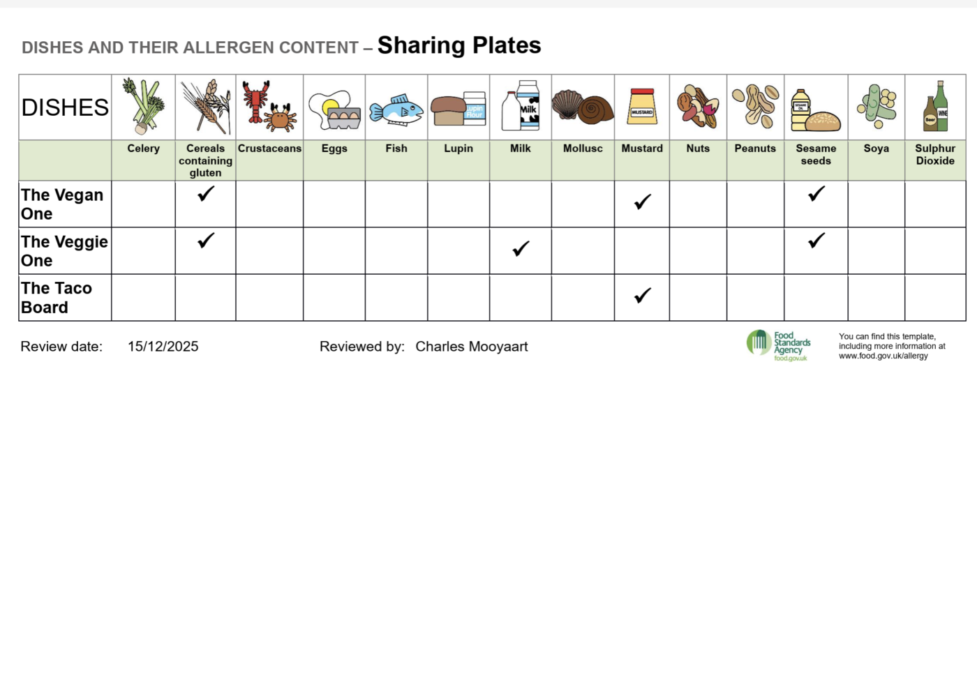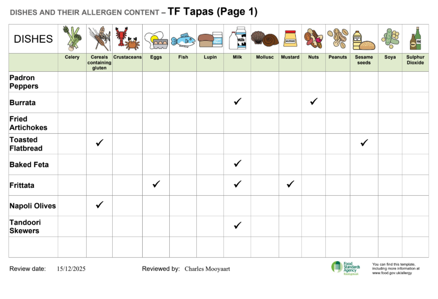 The allergen charts below show which of the 14 legally declarable allergens are contained in every dish on our menu. Because our recipes can change depending on availability